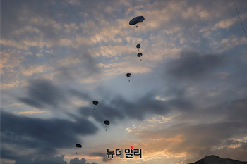육군사관학교 3학년 생도들이 8월 7일 특수전학교에서 진행된 공수기본훈련 중 300미터 상공의 기구로부터 힘차게 도약하며 낙하산을 펼치고 있다.육사 생도들은 지난 7월 초부터 이번 주까지 6주간 진행된 하계군사훈련을 성공적으로 마무리했다. 훈련 기간 동안 생도들은 미래