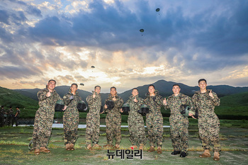 8월 6일 특수전학교에서 진행된 육군사관학교 3학년 생도 공수기본훈련 중 현역군인 아버지들과 생도인 아들들이 함께 성공적으로 강하를 한 후 기념사진을 촬영하고 있다.육사 생도들은 지난 7월 초부터 이번 주까지 6주간 진행된 하계군사훈련을 성공적으로 마무리했다. 훈련 기