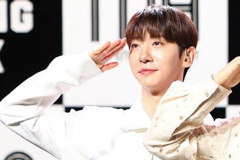 아이돌그룹 B.A.P 출신 유영재가 8일 오후 서울 강남구 일지아트홀에서 열린 첫 EP앨범 'CURTAIN CALL' 쇼케이스에서 포즈를 취하고 있다. 유영재는 이날 간담회에서 답변중 눈물을 훔치는 모습을 보이기도 했다. 이들은 팀명이 아니라 '방용국