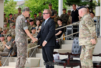 보리스 피스토리우스 독일 국방부장관이 2일 경기 평택 미군기지(캠프 험프리스)유엔사 연병장에서 열린 '독일, 유엔군사령부 가입 기념식'에서 폴 러캐머라 유엔사 사령관에게 독일 국기를 건네고 있다. (사진=공동취재단)