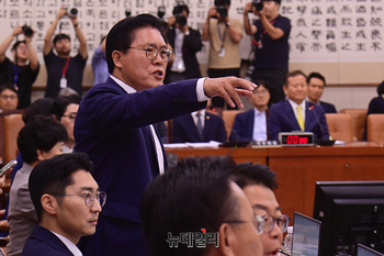 송석준 국민의힘 의원이 31일 오전 국회에서 열린 법제사법위원회 전체회의에서 정청래 위원장의 의사진행에 항의를 하고 있다.