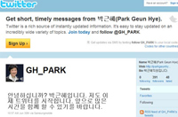 박근혜 전 한나라당 대표가 트위터 열풍에 합류했다. 박 전 대표는 세종시 수정안이 국회 본회의에서 부결된 다음날인 지난달 30일 오전 11시경 트위터(twitter.com/gh_park)에 "안녕하십니까 박근혜입니다. 저도 이제 트위터를 시작합니다. 앞으로 많은 시간을