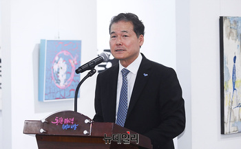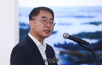 김영호 통일부 장관이 30일 오후 서울 중구 서울시청 시민청에서 열린 북한이탈작가 전시회 '기억의 지도, 남북 동시대성 연결하기' 개회식에서 인사말을 하고 있다.