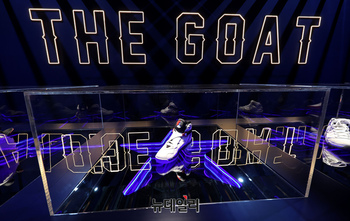 인천 중구 상상플랫폼에 공식 오픈을 앞둔 복합문화공간 뮤지엄엘이 25일 오전 개관식을 갖고 개관전시를 공개했다. 3관 '위대한 농구선수 75인전'에 마이클 조던의 우승 스니커가 전시돼 있다. NBA가 출범 75주년을 기념해 공개한 가장 위대한 선수 75인의 유