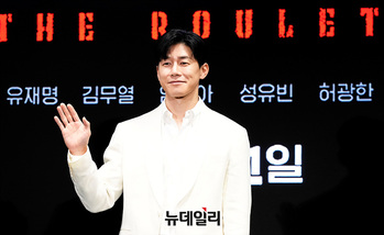 배우 유재명이 24일 오전 서울 여의도 콘래드 호텔에서 열린 디즈니 플러스 드라마 '노 웨이 아웃 : 더 룰렛' 제작발표회에서 포즈를 취하고 있다.드라마 '노 웨이 아웃 : 더 룰렛'은 희대의 흉악범이 출소하자 200억 원의 현상금을 건 '공개살인청부'가 벌어지는 가운