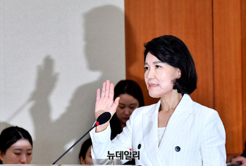 이진숙 방송통신위원장 후보자가 24일 오전 국회에서 열린 과학기술정보방송통신위원회의 인사청문회에서 증인선서를 하고 있다.