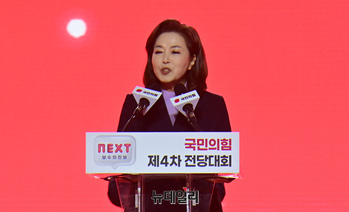 김민전 국민의힘 신임 최고위원이 23일 경기 고양시 킨텍스에서 열린 제4차 전당대회에서 당선 후 수락연설을 하고 있다. (경기 고양=이종현 기자)