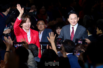 나경원·원희룡 국민의힘 당대표 후보가 23일 경기 고양시 킨텍스에서 열린 제4차 국민의힘 전당대회에 입장하고 있다. (경기 고양=이종현 기자)