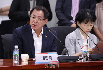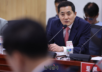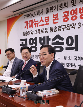 박대출 국민의힘 의원이 18일 오전 국회의원회관에서 가짜뉴스 백서 출판기념으로 열린 '방송장악과 공영방송의 미래' 토론회에서 인사말을 하고 있다. 이날 토론회는 이준용 자유언론국민연합 공동대표의 사회로 황근 선문대 교수, 오정환 전 MBC보도본부장, 이영풍 전