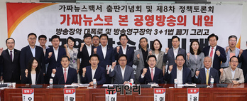 새미래포럼이 주관한 '방송장악과 공영방송의 미래' 토론회 참석자들이 18일 오전 국회의원회관에서 열린 토론회에서 기념촬영을 하고 있다. 이날 토론회는 가짜뉴스백서 출판을 기념해 방송장악 대폭로 및 방송영구장악 3+1법 폐기와 공영방송 미래를 주제로 열렸다.&n