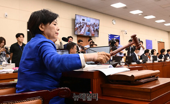 최민희 위원장이 16일 오후 서울 여의도 국회에서 열린 과학기술정보방송통신위원회 전체회의에서 의사봉을 두드리고 있다.