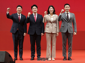국민의힘 청년최고위원 후보들이 15일 오후 충남 천안시 유관순체육관에서 열린 대전·세종·충북·충남 합동연설회에서 기념촬영을 하고 있다. 국민의힘은 7월 23일 일산 킨텍스에서 당대표, 최고위원, 청년최고위원을 선출하는 제4차 전당대회를 개최할 예정이다. (충남
