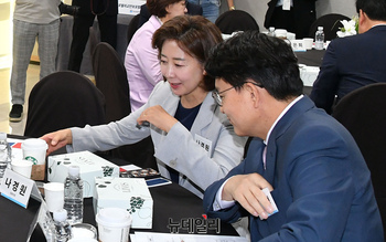 나경원 국민의힘 당대표 후보와 추경호 원내대표가 15일 오전 국회에서 열린 '국회 글로벌외교안보포럼 창립총회 및 기념특강'에서 대화를 나누고 있다.