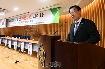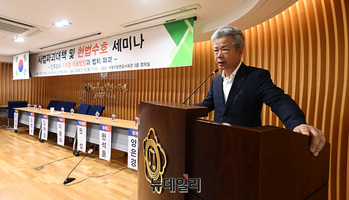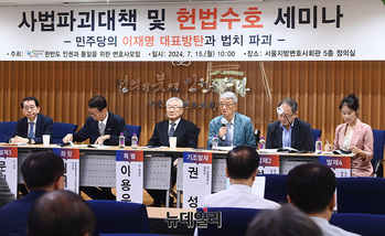 한반도 인권과 통일을 위한 변호사모임이 15일 오전 서울 서초구 서울지방변호사회관에서 '민주당의 이재명 대표 방탄과 법치 파괴'를 주제로 열린 사법파괴대책 및 헌법수호 세미나를 개최하고 있다.이날 세미나는 이재원 한변 회장이 환영사를, 김영훈 대한변호사협회
