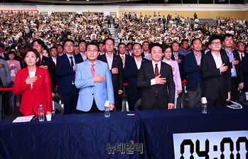 나경원, 윤상현, 원희룡, 한동훈 국민의힘 당 대표 후보가 12일 오후 대구 북구 엑스코에서 열린 '제4차 전당대회 대구·경북 합동연설회'에 참석해 자리하고 있다. 국민의힘은 23일 일산 킨텍스에서 전당대회를 개최할 예정이다. (대구=서성진 기자)