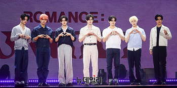 그룹 엔하이픈 니키(왼쪽부터), 희승, 제이크, 성훈, 정원, 선우, 제이가 11일 오후 서울 송파구 올림픽공원 핸드볼경기장에서 열린 정규 2집 '로맨스 : 언톨드(ROMANCE : UNTOLD)' 발매 기념 쇼케이스에서 포즈를 취하고 있다.이번 앨범은 타이틀곡 '엑스