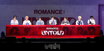 그룹 엔하이픈 니키, 희승, 제이크, 성훈, 정원, 선우, 제이가 11일 오후 서울 송파구 올림픽공원 핸드볼경기장에서 열린 정규 2집 '로맨스 : 언톨드(ROMANCE : UNTOLD)' 발매 기념 쇼케이스에서 취재진의 질문에 답하고 있다. 이번 앨범은 타이틀