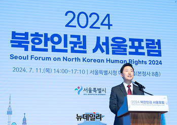 오세훈 서울시장이 11일 오후 서울시청에서 '자유를 향한 여정, 북한이탈주민과의 동행'을 주제로 열린 '2024 북한인권 서울포럼'에서 환영사를 하고 있다.이번 포럼은 북한 주민의 삶과 인권 실상을 시민들에게 알리고 북한인권을 개선하기 위한 국제사회와의 협력방안을 마련