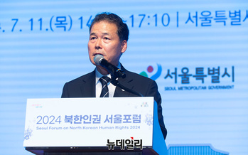 김영호 통일부 장관이 11일 오후 서울시청에서 '자유를 향한 여정, 북한이탈주민과의 동행'을 주제로 열린 '2024 북한인권 서울포럼'에서 축사를 하고 있다.이번 포럼은 북한 주민의 삶과 인권 실상을 시민들에게 알리고 북한인권을 개선하기 위한 국제사회와의 협력방안을 마