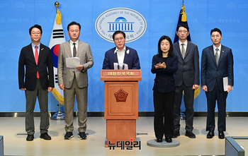 송석준 국민의힘 의원을 비롯한 법제사법위원회 의원들이 11일 오전 국회 소통관에서 열린 법치주의 훼손 삼권분립 유린 자행하는 민주당 규탄 기자회견에서 성명을 발표하고 있다.