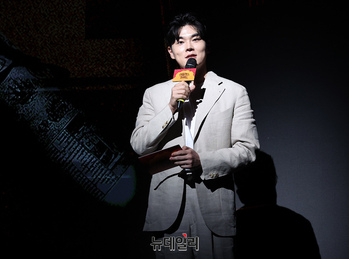 이인권 아나운서가 9일 오후 서울 강남구 광림아트센터 BBCH홀에서 열린 뮤지컬 코미디 '젠틀맨스 가이드: 사랑과 살인편' 프레스콜에서 작품 소개를 하고 있다. 뮤지컬은 7월 6일부터 10월 20일까지 BBCH홀에서 공연된다.