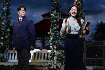 배우 김아선, 송원근이 9일 오후 서울 강남구 광림아트센터 BBCH홀에서 열린 뮤지컬 코미디 '젠틀맨스 가이드: 사랑과 살인편' 프레스콜에서 하이라이트 장면을 시연하고 있다. 뮤지컬은 7월 6일부터 10월 20일까지 BBCH홀에서 공연된다.