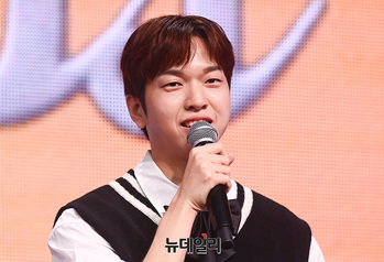 코미디언 유재필이 9일 오후 서울 마포구 신한 SOL 페이 스퀘어에서 열린 미니6집 '블리스(Bliss)' 발매 기념 쇼케이스에서 걸그룹 위클리를 소개하고 있다.이번 앨범은 타이틀곡 '라이츠 온(LIGHTS ON)' 을 포함해 '트웬티스(Twenties)' '댄스 댄스