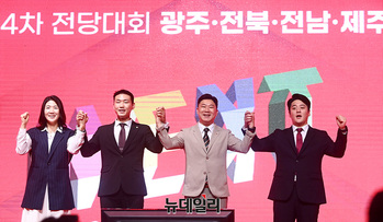 김은희, 김정식, 진종오, 박상현 국민의힘 청년최고위원 후보가 8일 오후 광주 서구 김대중컨벤션센터에서 열린 '제4차 전당대회 광주·전북·전남·제주 합동 연설회'에서 기념촬영을 하고 있다. (광주=서성진 기자)