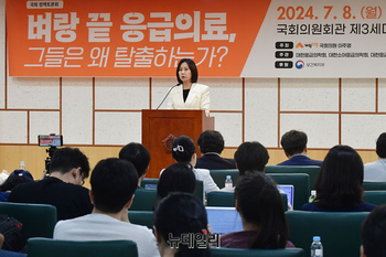 허은아 개혁신당 대표가 8일 오후 국회 의원회관에서 이주영 의원실 주최로 열린 '벼랑 끝 응급의료, 그들은 왜 탈출하는가' 정책토론회에서 축사를 하고 있다.