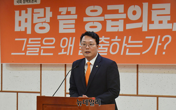 천하람 개혁신당 원내대표가 8일 오후 국회 의원회관에서 이주영 의원실 주최로 열린 '벼랑 끝 응급의료, 그들은 왜 탈출하는가' 정책토론회에서 축사를 하고 있다.