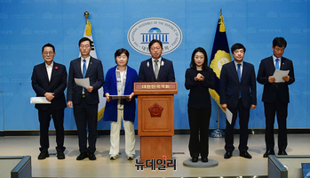 더불어민주당 국회 법제사법위원회 소속 위원들이 8일 오전 국회 소통관에서 기자회견을 열고 '해병대 수사 외압, 검찰의 특활비 부정 사용 사건'에 대한 고위공직자범죄수사처에 신속 수사를 촉구하고 있다.