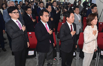 국민의힘 나경원·원희룡·윤상현·한동훈 당대표 후보가 5일 오후 서울 여의도 중앙당사에서 열린 '미래를 위한 약속, 공정 경선 서약식'에서 국민의례를 하고 있다.