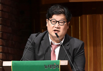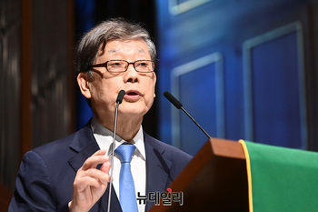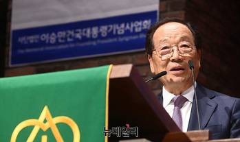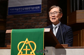 41대 국무총리를 지낸 김황식 이승만대통령 기념재단 이사장이 5일 오후 서울 중구 정동교회에서 '이승만과 대한민국'을 주제로 열린 한미우남포럼에서 축사를 하고 있다.이날 1부 행사는 최재형 트러스트포럼 대표의 개회선언을 시작으로 김남수 이승만건국대통령기념사업회 회장이