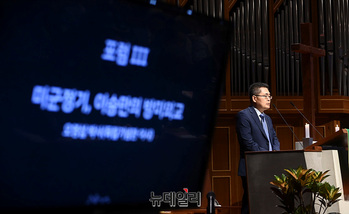 원성웅 목사가 5일 오후 서울 중구 정동교회에서 '이승만과 대한민국'을 주제로 열린 한미우남포럼에서 '이승만과 아펜젤러'를 발표하고 있다.이날 1부 행사는 최재형 트러스트포럼 대표의 개회선언을 시작으로 김남수 이승만건국대통령기념사업회 회장이 대회사를, 김영기 조지워싱턴