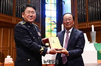 김남수 이승만건국대통령기념사업회 회장이 5일 오후 서울 중구 정동교회에서 '이승만과 대한민국'을 주제로 열린 한미우남포럼에서 서월석 경정에게 이승만 라인상을 수여하고 있다.이날 1부 행사는 최재형 트러스트포럼 대표의 개회선언을 시작으로 김남수 이승만건국대통령기념사업회