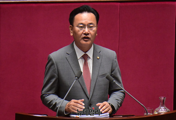 유상범 국민의힘 의원이 3일 오후 국회에서 열린 본회의에서 순직 해병 수사 방해 및 사건 은폐 등의 진상규명을 위한 특별검사의 임명 등에 관한 법률안에 대한 필리버스터(무제한 토론)를 하고 있다.