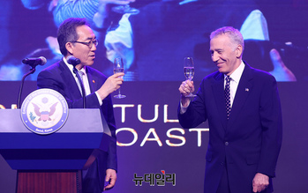 조태열 외교부 장관과 필립 골드버그 주한 미국대사가 3일 오후 서울 용산구 그랜드 하얏트 서울에서 열린 미국 독립기념일 행사에서 건배 제의를 하고 있다. (사진=공동취재단)