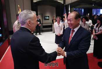 필립 골드버그 주한 미국대사와 황우여 국민의힘 비상대책위원장이 3일 오후 서울 용산구 그랜드 하얏트 서울에서 열린 미국 독립기념일 행사에서 인사를 나누고 있다. (사진=공동취재단)