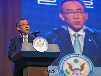 조태열 외교부 장관이 3일 오후 서울 용산 그랜드 하얏트 호텔 그랜드 볼룸에서 열린 미국 독립기념일 행사에서 축사하고 있다. (사진=공동취재단)
