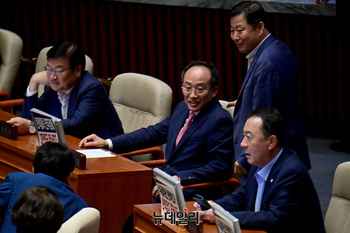 추경호 국민의힘 원내대표가 3일 오후 국회에서 열린 본회의에서 의원들과 대화를 나누고 있다.