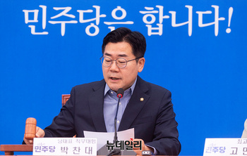 박찬대 더불어민주당 당대표 직무대행이 3일 오전 서울 여의도 국회에서 열린 최고위원회의에서 속개선언을 하고 있다.