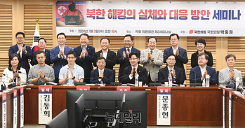 박충권, 신성범, 윤재옥, 한기호 국민의힘 의원과 주호영 국회부의장을 포함한 참석자들이 3일 오전 서울 여의도 국회 의원회관에서 열린 '북한 해킹의 실체와 대응 방안 세미나'에서 기념촬영을 하고 있다.