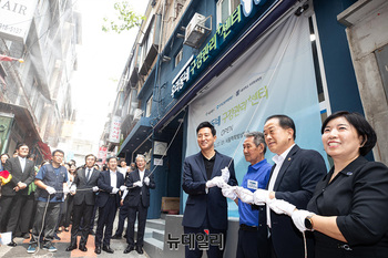 오세훈 서울시장과 참석자들이 1일 오후 서울 용산구 동자동 쪽방촌 주민들이 무료로 치과 진료를 받을 수 있는 '우리동네구강관리 플러스센터' 개소식에서 기념 촬영을 하고 있다.