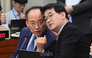 추경호 국민의힘 원내대표와 배준영 원내수석부대표가 1일 오전 서울 여의도 국회에서 열린 운영위원회의에서 대화를 나누고 있다. 추 원내대표는 22대 국회 상임위원회 구성에 대한 책임을 지고 원내대표직 사퇴 의사를 밝혔으나, 당내 의원들의 요청에 따라 닷새만인 지