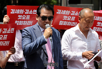 국민의힘 7·23 전당대회 선거관리위원회가 최고위원·청년최고위원 후보 자격심사에서 탈락한 김세의 가로세로연구소 대표와 김소연 변호사를 '재심사'할 방침을 밝힌 가운데, 우파 시민단체 관계자들이 1일 서울 여의도 국민의힘 당사 앞에서 두 사람에 대한 '컷오프(경선 배제)