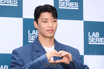 축구선수 황희찬이 1일 오후 서울 중구 롯데백화점 본점에서 열린 '랩 시리즈 팝업스토어' 포토월에서 포즈를 취하고 있다.