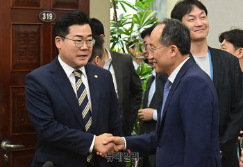 추경호 국민의힘 원내대표가 1일 오전 국회에서 열린 운영위 전체회의에 참석해 박찬대 더불어민주당 원내대표와 악수를 나누고 있다.추 원내대표는 22대 국회 상임위원회 구성에 대한 책임을 지고 원내대표직 사퇴 의사를 밝혔으나, 당내 의원들의 요청에 따라 닷새만인 지난달 2