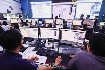 강남도시관제센터가 1일 오전 서울 강남구 역삼지구대에서 'AI 기반 지능형 선별관제시스템 공개 시연'을 하고 있다.이번 시연에서 소개된 강남구의 스마트시티 통합 플랫폼과 AI 기반 선별관제시스템은 소방, 경찰 등과 연계된 CCTV 공유 및 협업을 통해 7,721대 중