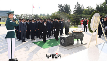 우원식 국회의장, 주호영 국회부의장, 정당 원내대표, 상임위원장단 등 참석자들이 28일 오전 서울 동작구 국립서울현충원을 찾아 참배하고 있다.