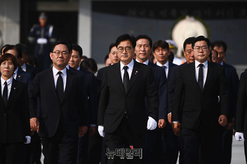 우원식 국회의장, 주호영 국회부의장, 정당 원내대표, 상임위원장단 등 참석자들이 28일 오전 서울 동작구 국립서울현충원을 찾아 참배를 마치고 이동하고 있다.